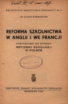 Title: Reforma szkolnictwa w Anglii i we Francji : przyczynek do sprawy reformy szkolnej w Polsce